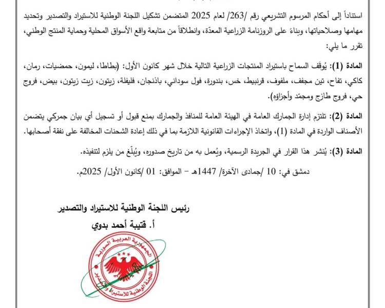 أصدرت اللجنة الوطنية للاستيراد......اقرأ أكثر