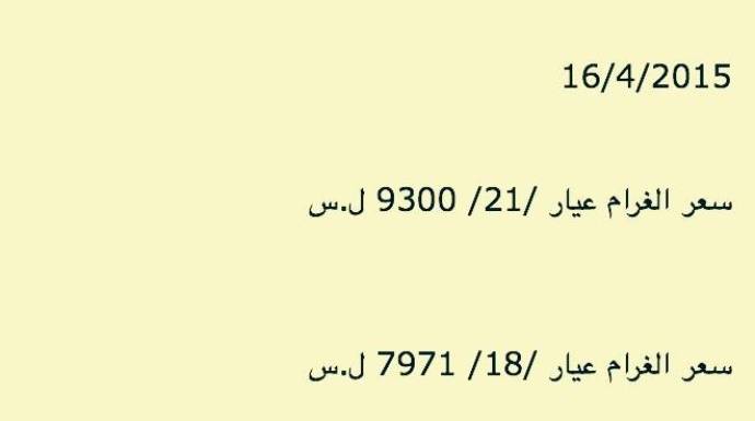 وبات سعر غرام الذهب عيار الـ 21 بـ 9300 ليرة، بزيادة 150 ليرة على سعر أمس الأربعاء، فيما بات سعر غرام الـ 18 بـ 7971 ليرة.