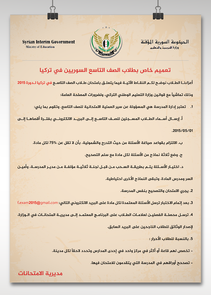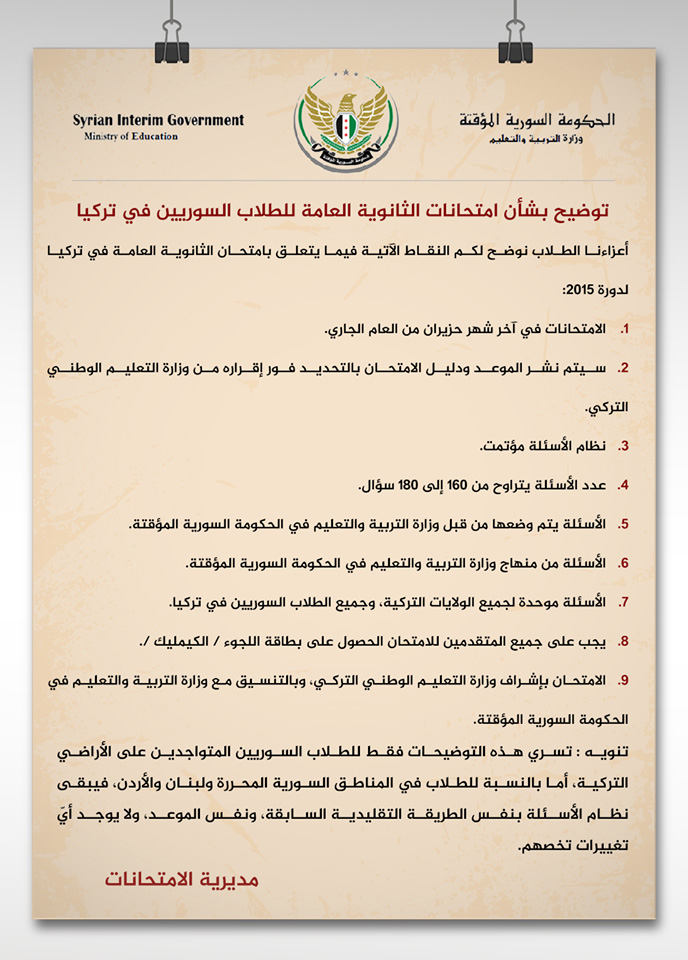 نشرت وزارة التعليم والتربية بالحكومة السورية المؤقتة تعميمين يوضحان تعليمات امتحانات التاسع والبكالوريا للسوريين المقيمين بتركيا حصراً.
