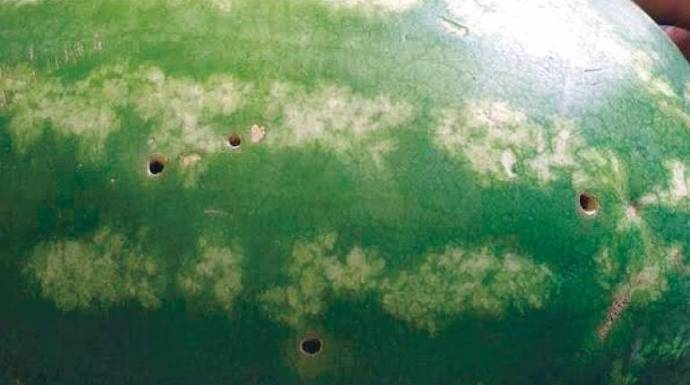 وبين أن الثقوب الموجودة بأسطح عينات البطيخ ناتجة عن إصابات حشرية قديمة من حشرة ثمار تسمى خنفساء القرعيات، والتي أكملت دورة حياتها وأنه لا وجود للحشرة أو أي طور من أطوار حياتها في الثمرة.