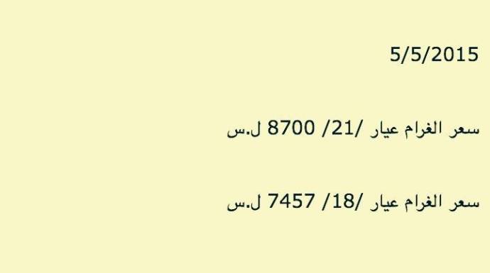 وحسب بيان للجمعية الحرفية للصياغة وصنع المجوهرات بدمشق، اليوم الثلاثاء، بات سعر غرام الـ 21 بـ 8700 ليرة، بتراجع 300 ليرة عن سعر أمس الاثنين، فيما بات سعر غرام الـ 18 بـ 7457 ليرة.