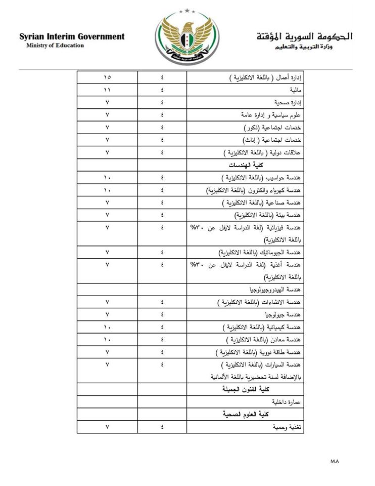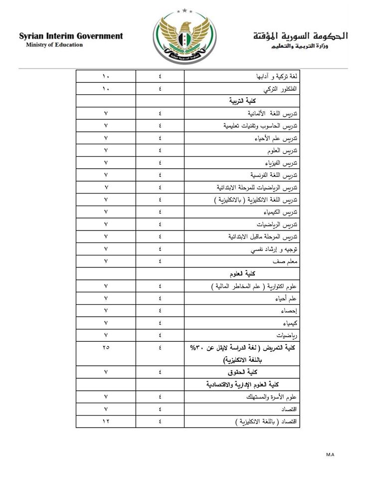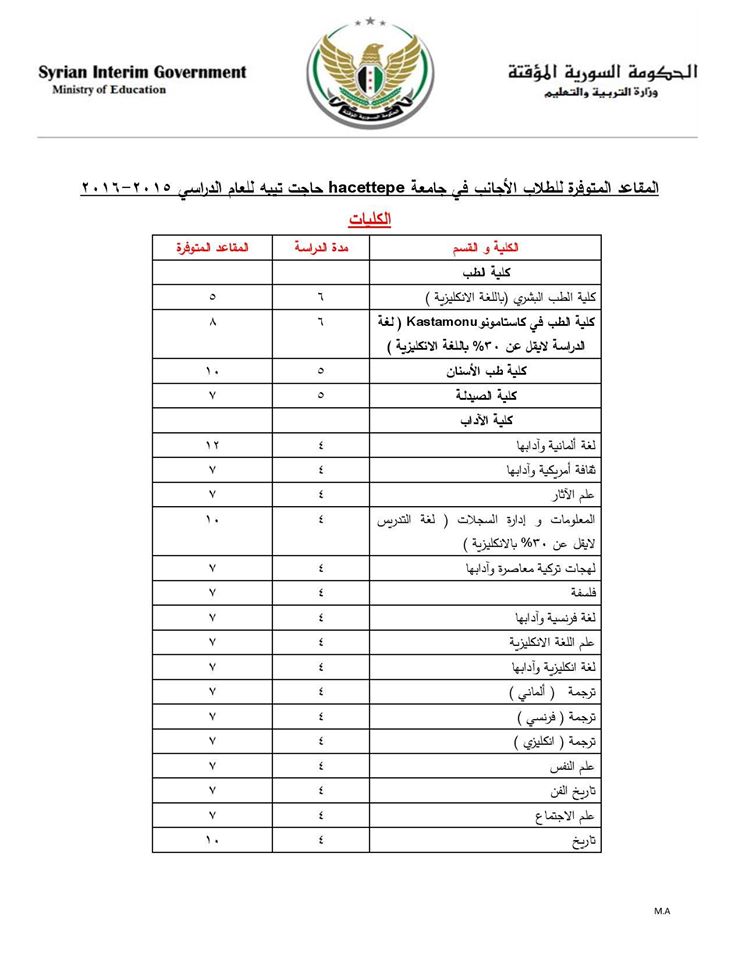 نشرت وزارة التربية والتعليم في الحكومة السورية المؤقتة إعلاناً حول المقاعد المتاحة للتسجيل في جامعة "hacettepe - حاجت تيبه" التركية في أنقرة.