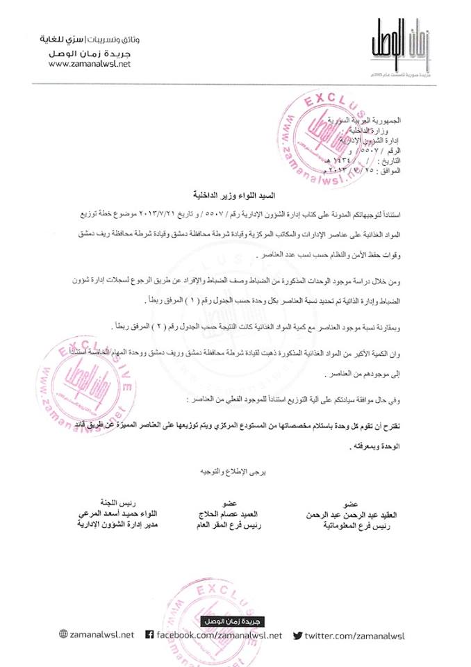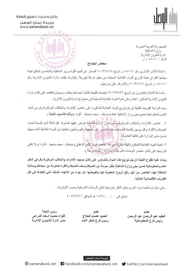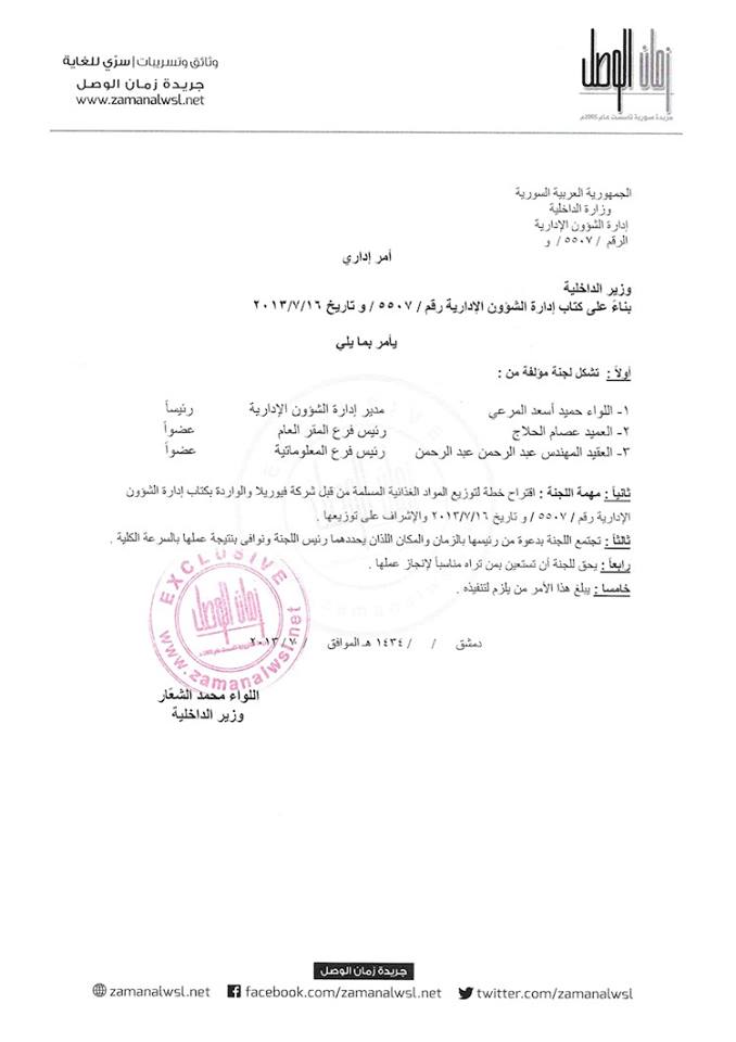 وبعد هذه الوثيقة بيومين، أي في 18/7، وبسرعة تناقض البيروقراطية المعهودة في مؤسسات النظام، صدر أمر إداري من رأس هرم الوزارة (الوزير نفسه)، يسمي لجنة مكونة من 3 ضباط كبار (لواء وعميد وعقيد)، مهمتها الوحيدة: "اقتراح خطة لتوزيع المواد الغذائية المسلمة من قبل شركة فيوريلا والواردة بكتاب إدارة الشؤون الإدارية رقم /5507/ وتاريخ 16/7/2013 والإشراف على توزيعها".