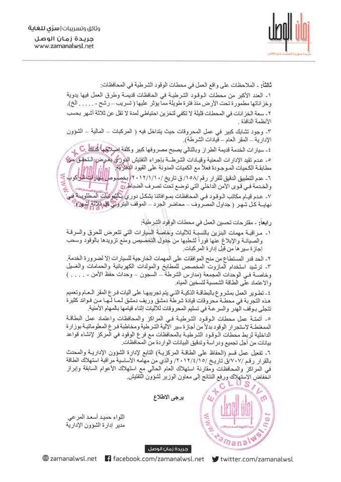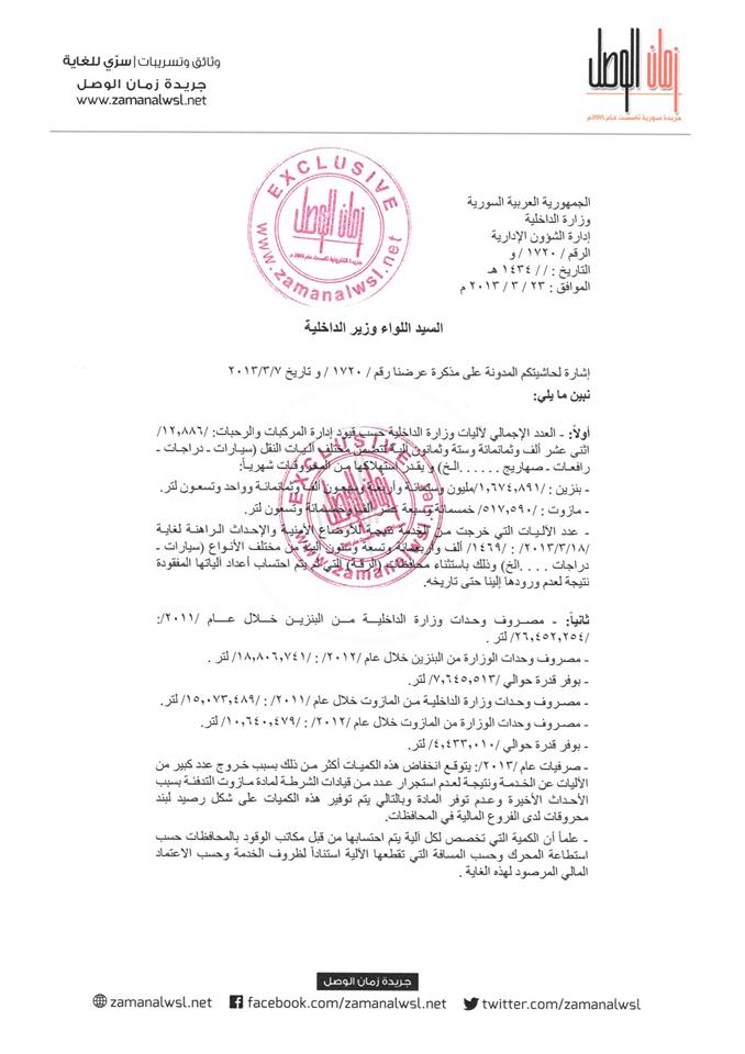 وتوضح وثيقة أخيرة مؤرخة في 25/7، "توجيهات" الوزير التي قضت بتوزيع "المكرمة" على عناصر الإدارات والمكاتب المركزية (ضمن مبنى الوزارة)، فضلا عن قيادتي شرطة محافظة دمشق ومحافظة ريف دمشق وقوات حفظ الأمن والنظام.