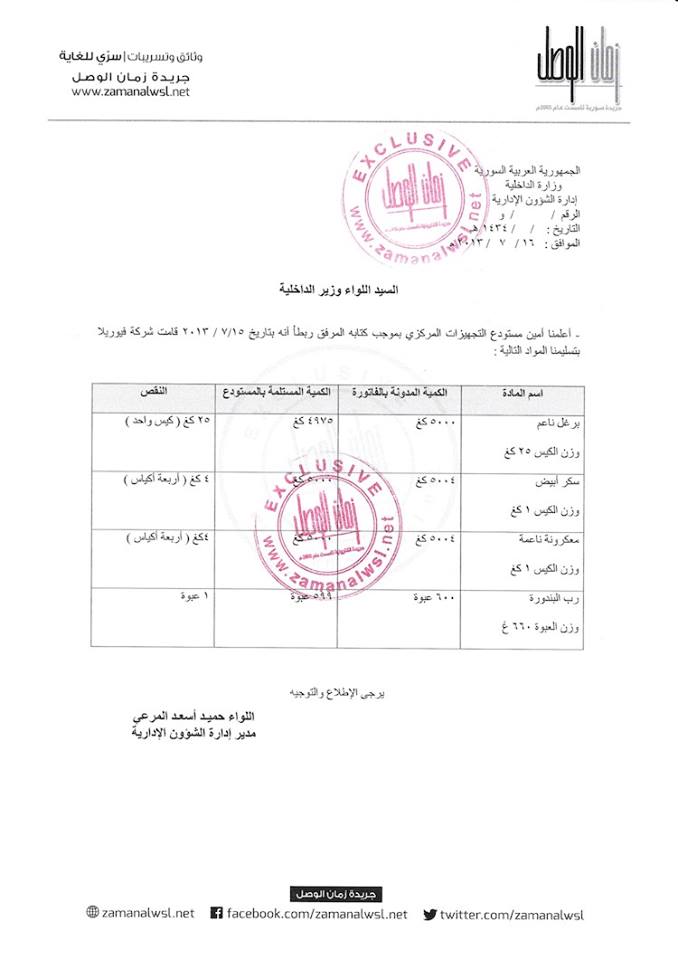 ففي الكتاب الأول الموجه إلى وزير الداخلية "محمد الشعار"، والمؤرخ في 16/7/2013، يعرض مدير إدارة الشؤون الإدارية مفصل الكميات التي استلمها مستودع الوزارة من شركة "فيوريلا"، وهي عبارة عن 15 ألف كيلو غرام من البرغل الناعم والسكر والمعكرونة (بواقع 5 آلاف كيلو تقريبا لكل مادة)، فضلا عن 600 عبوة من "رب البندورة".