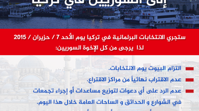 وجه نشطاء نصائح ودعوات للسوريين بالتزام الحياد وتجنب الاستفزاز والتورط بأي نشاطات قد تشوش على الحياد السوري في الانتخابات البرلمانية التركية المزمع إجراؤها يوم الأحد 7 حزيران 2015.
