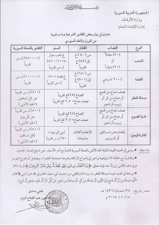 أصدرت وزارة الأوقاف في حكومة النظام جدولاً يضم "نصاب الزكاة" وقيمته على الليرة السورية، لهذا العام، في سوريا.