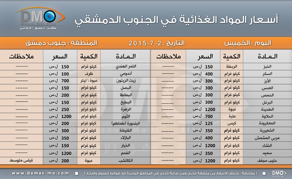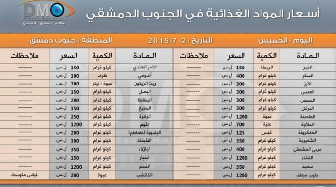 نشر "مكتب دمشق الإعلامي" قائمة بأسعار بعض المواد الغذائية والتموينية في جنوب دمشق منذ بداية شهر رمضان.