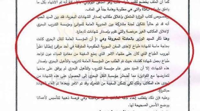 وجاءت هذه المعلومات ضمن "محضر اجتماع مجلس إدارة المؤسسة العامة للتدريب والتأهيل البحري"، تم عقده برئاسة وزير النقل "غزوان خيربك"، وحضور كبار المسؤولين في قطاع النقل البحري، بتاريخ 7/6/2015.