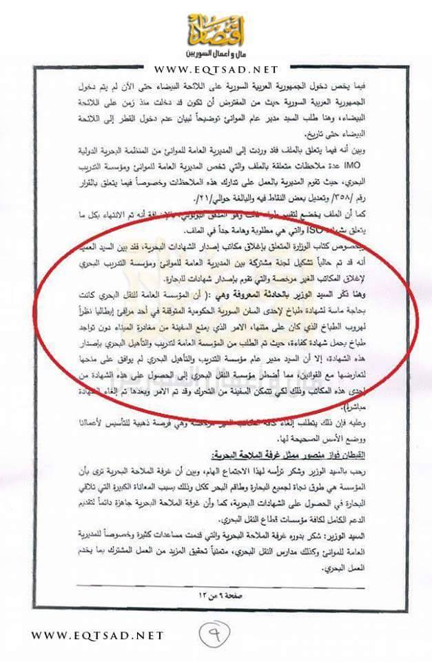 المحضر الذي حصلت "اقتصاد" على نسخة كاملة منه، تضمن في صفحته التاسعة إقرارا من وزير النقل بلجوء "المؤسسة العامة للنقل البحري" إلى إحدى المكاتب غير المرخصة للحصول على شهادة "طباخ" لأحد البحارة، بعد هروب "طباخ" سفينة سورية حكومية، بينما كانت في رحلة إلى إيطاليا.