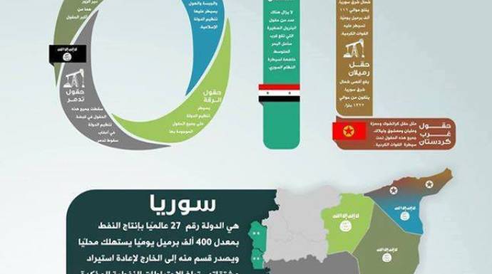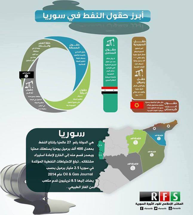 نشر "المكتب الإعلامي لقوى الثورة السورية"، "انفوغرافيك"، يوضح أهم حقول النفط السورية، والقوى المسيطرة عليها.