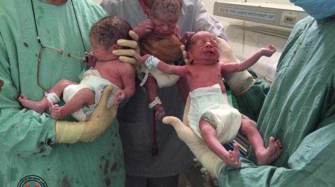 ونشرت صفحة "مستشفى الغوطة التخصصي" في "فيسبوك"، صورة للتوائم الثلاثة.