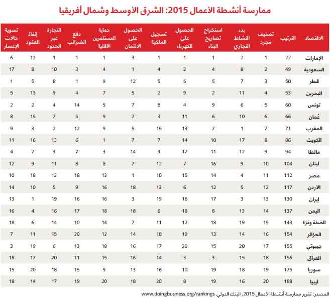 في الحقيقة، المغرب تصنف أولاً بين نظرائها الإقليميين في فئة بدء النشاط التجاري، رغم أنها هبطت 7 مراكز عالمياً، مقارنة بعام 2014 حين حلت بالمركز 47 إجمالاً فيما يتعلق بإقامة المشاريع. من ناحية أخرى، ظل العراق وسوريا وليبيا لأسباب معروفة في أسفل القائمة. لكن من الجدير بالذكر أن العراق المحاصر بالمتاعب يستحق الاحترام لأنه احتل المركز الـ3 بالمنطقة في فئتين: استخراج تراخيص البناء والحصول على الكهرباء. وفي هذا قليل من العزاء نظراً إلى الازمة الحالية في البلاد، كما حققت سوريا نتيجة مرتفعة أيضاً؛ على نحو يثير الغرابة، في حماية المستثمرين الأقلية، إذ جاءت بالمرتبة الـ5 على مستوى المنطقة.