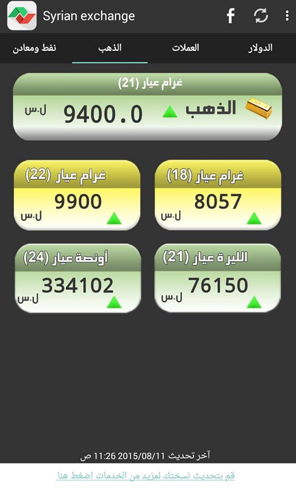 وأصبح سعر غرام الـ 21 ذهب بـ 9400 ليرة، فيما أصبح سعر غرام الـ 18 بـ 8057 ليرة.