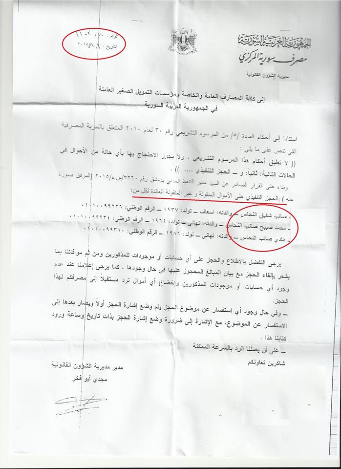 وجه مصرف النظام المركزي كتاباً للمصارف العامة والخاصة يقضي بالحجز التنفيذي على الأموال المنقولة وغير المنقولة لرجل الأعمال المقرب من النظام صائب النحاس واثنين من أبنائه وذلك تنفيذاً لقرار قضائي في هذا الشأن.