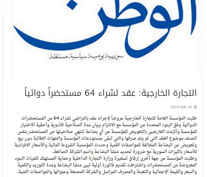 أعلنت المؤسسة العامة للتجارة الخارجية التابعة "لحكومة النظام" عن طلب عروض لشراء 64 من المستحضرات الدوائية. وتأتي هذه الخطوة في الوقت التي تعاني فيه سوريا نقصاً حاداً في الأدوية والمنتجات الصيدلانية، وتشير بعض التقديرات إلى أن أكثر من 75% من المصانع الدوائية أجبرت على الإغلاق، والمصانع الأخرى تعمل بأقل من ربع طاقتها الإنتاجية، وتشير التوقعات إلى وجود نقص بنسبة 70% من حاجة السوق.