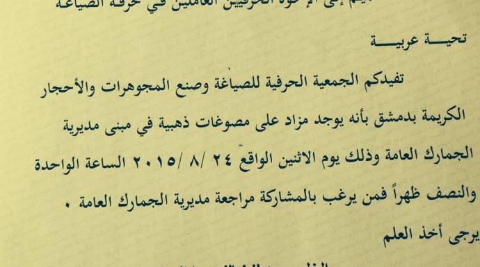 بدورها، عممت جمعية الصاغة بدمشق على حرفييها دعوة لمزاد على مصوغات ذهبية في مبنى مديرية الجمارك العامة يوم الاثنين 24/8/2015، الساعة الواحدة والنصف ظهراً. وتتطلب المشاركة مراجعة مديرية الجمارك العامة.