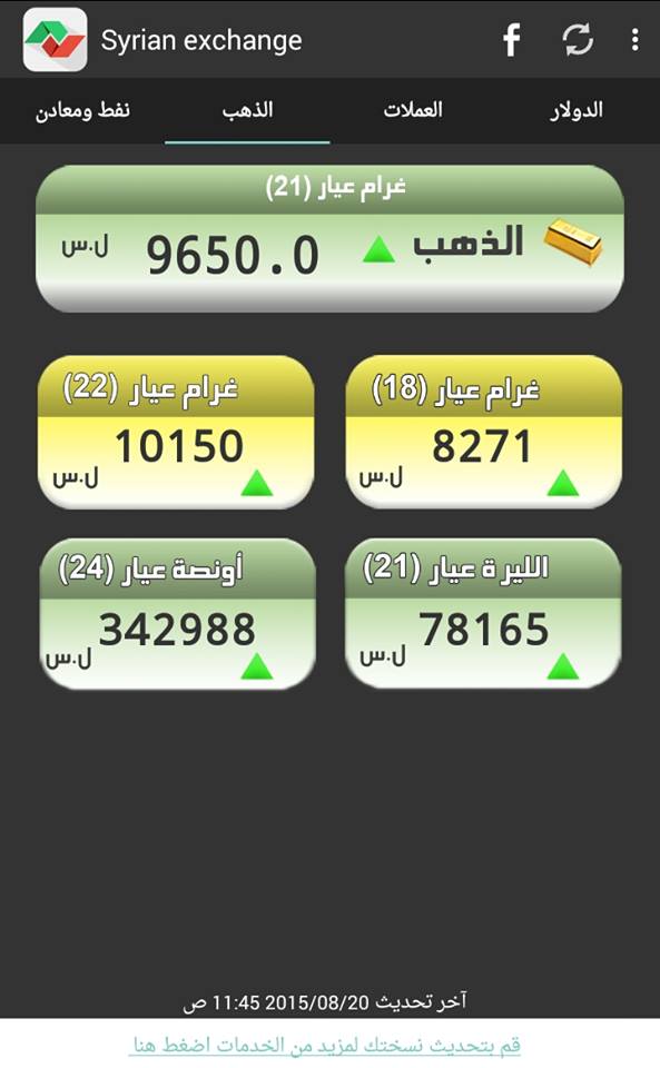وكان الدولار قد ارتفع 6 ليرات منذ انتهاء جلسة تدخل مصرف سوريا المركزي، عصر أمس الأول الثلاثاء. فيما ارتفع الذهب عالمياً، مساء أمس الأربعاء، بنسبة 0.4%.