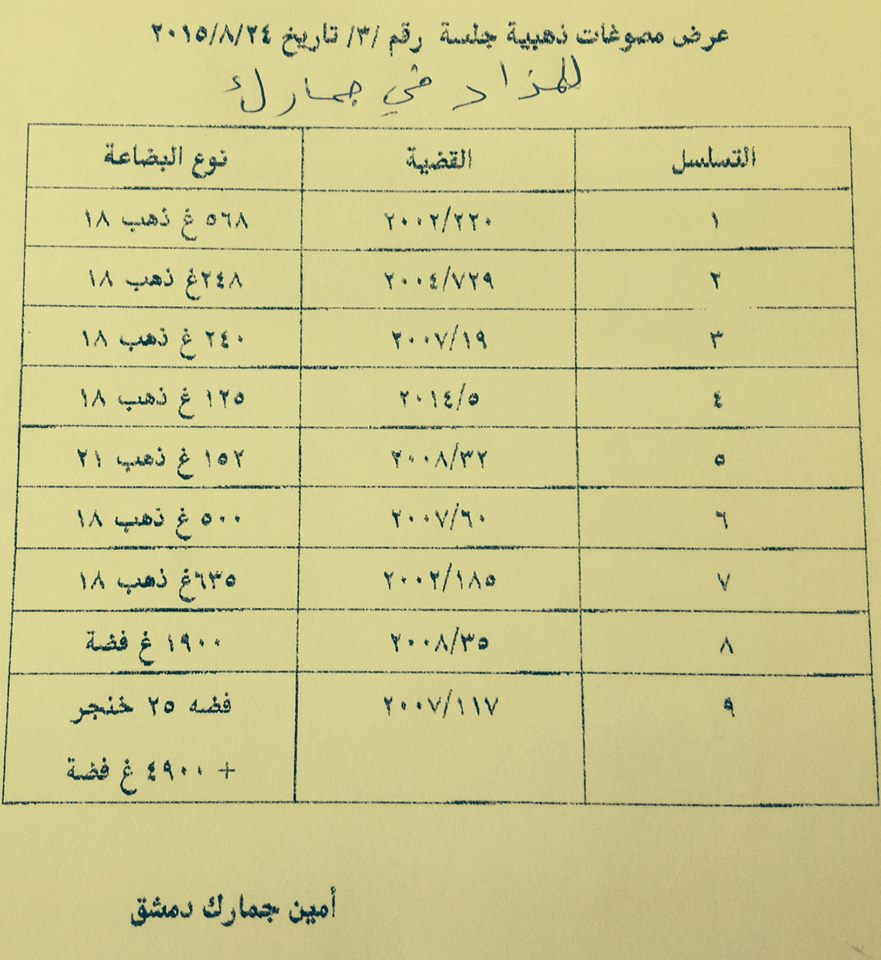 بدورها، نشرت صفحة جمعية الصاغة بدمشق، في "فيسبوك"، قائمة توضح عيارات المصوغات الذهبية والفضية، المطروحة للمزاد العلني في مبنى مديرية الجمارك العامة، بتاريخ 24/8، وكميات هذه المصوغات.