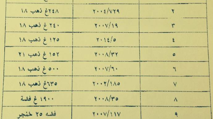 ويظهر من القائمة أن كميات المصوغات الذهبية تتجاوز 2 كيلو ذهب، وكذلك تتجاوز كميات المصوغات الفضية 2 كيلو فضة، بينها خناجر فضة. ويُعتقد أن هذه المصوغات هي من مصادرات الجمارك، وقد تكون ذهباً مُهرباً، أو مخالفاً للمواصفات.
