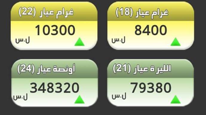 وسجل الذهب بدمشق، حسب جمعية الصاغة، 9800 ليرة لغرام الـ 21، بزيادة 50 ليرة، و8400 ليرة لغرام الـ 18.