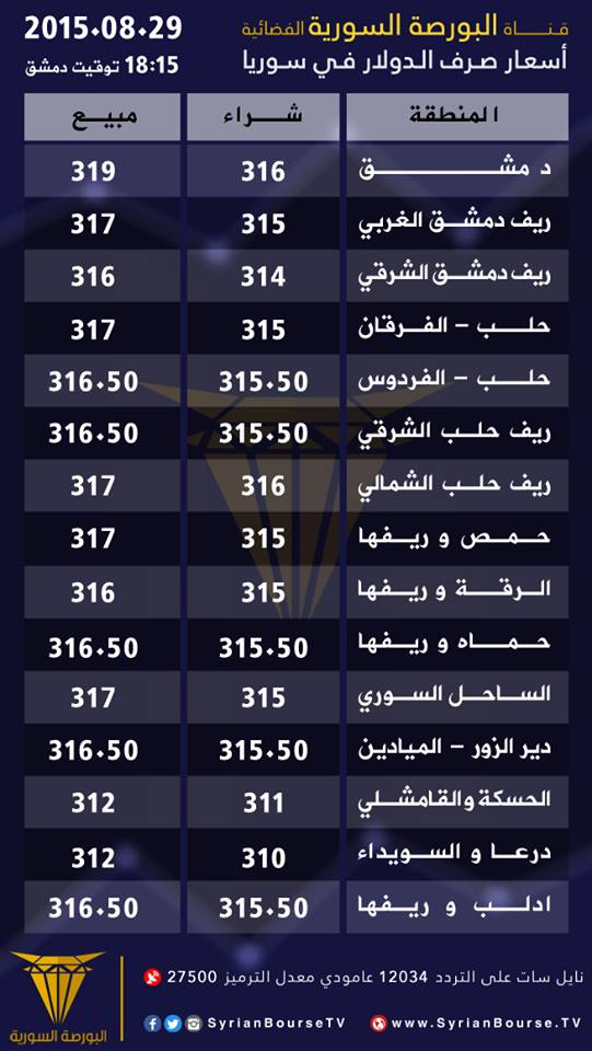 وفيما يلي قائمة بأسعار الدولار في المحافظات والمناطق السورية، برعاية "قناة البورصة السورية":