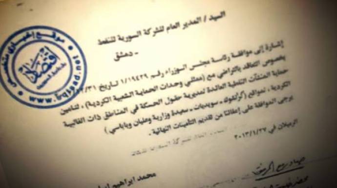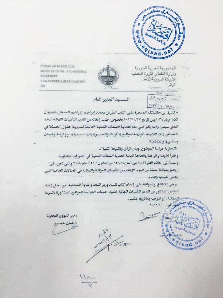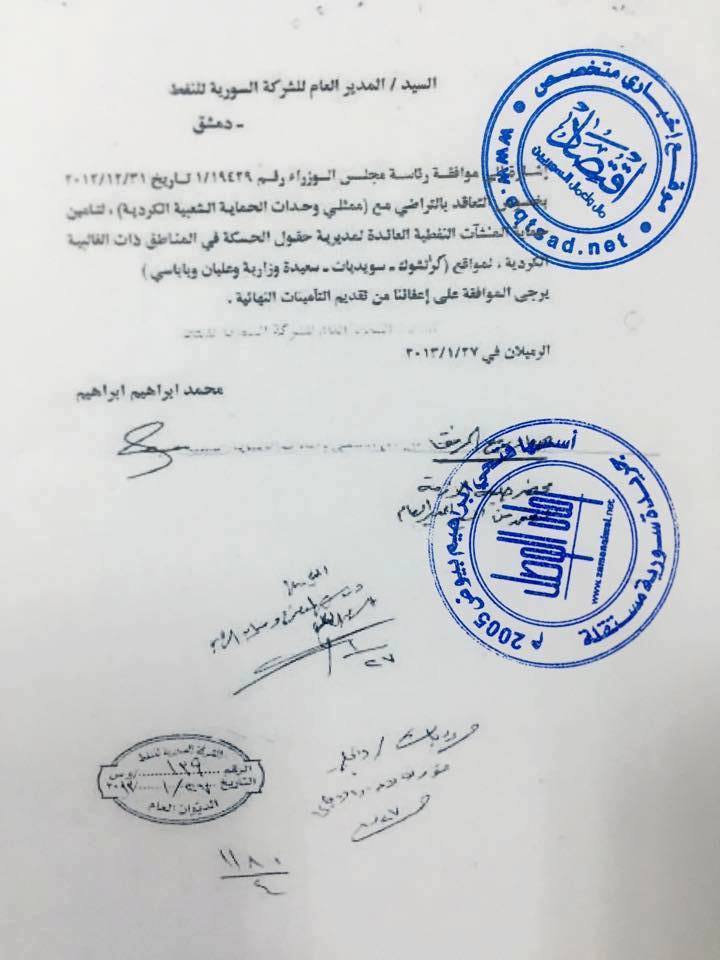 وتكشف الوثيقة أن ممثل وحدات حماية الشعب الكردية، محمد إبراهيم إبراهيم، عرض على الشركة السورية للنفط حماية 6 مواقع من حقول رميلان، وفق "عقد بالتراضي". وطلب ممثل وحدات الحماية من الشركة السورية للنفط إعفائه من دفع التأمينات النهائية المُتعارف عليها في حالة التعاقد مع الجهات الرسمية السورية.