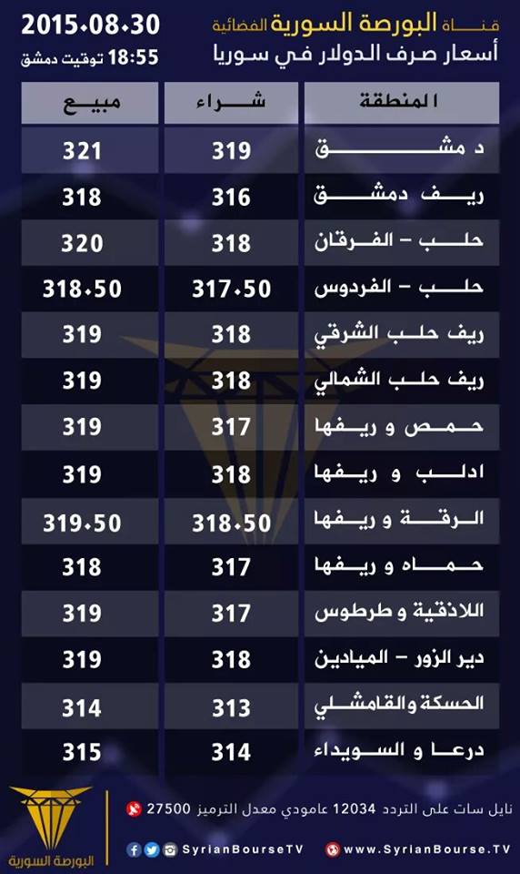 وبعد تذبذب، ارتفع فيه مبيع الدولار بدمشق إلى 321 ليرة، لينخفض بعدها إلى 319 ليرة. عاد الدولار ليرتفع ويغلق عند 321 ليرة مبيع.
