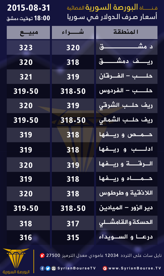وفيما يلي قائمة بأسعار الدولار في العاصمة ومختلف المناطق والمحافظات السورية، مساء اليوم الاثنين، برعاية "قناة البورصة السورية":
