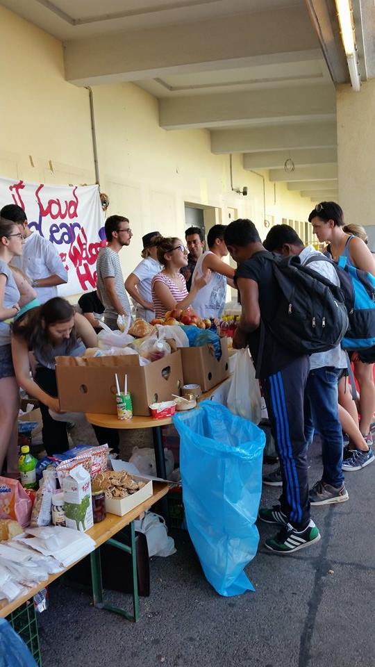 وتُظهر صورتان توزيع الطعام والشراب مجاناً على اللاجئين الواصلين لمحطة القطار بفيينا.