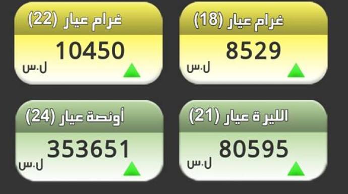 وارتفع الذهب بدمشق، ليصبح بـ 9950 ليرة لغرام الـ 21، و8529 ليرة لغرام الـ 18.