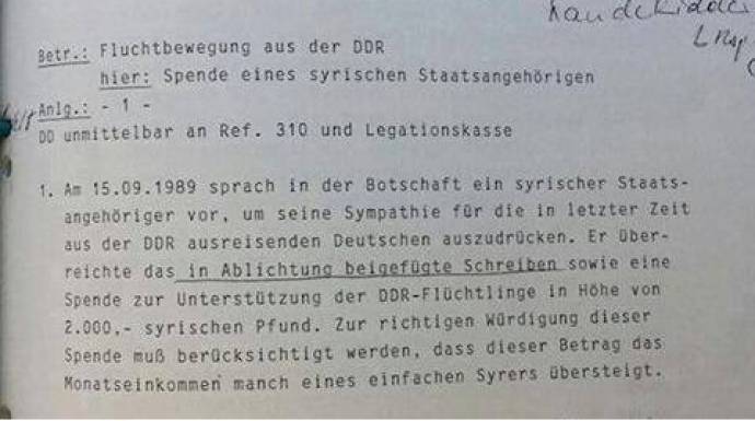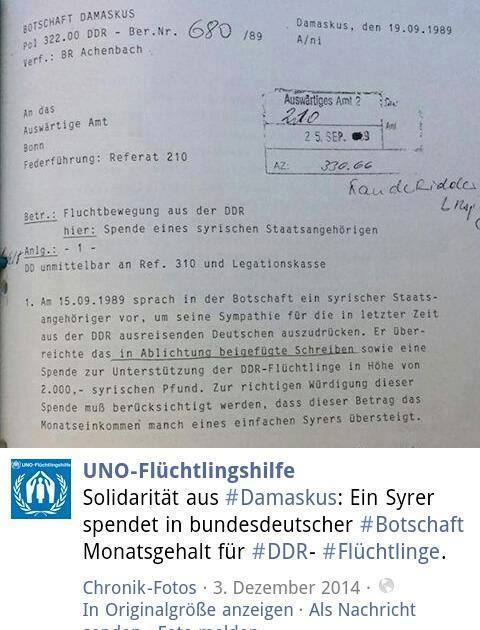 تداول ناشطون على صفحات "فيسبوك" صورة وثيقة قيل إن السفارة الألمانية في دمشق بعثت بها إلى الخارجية. وتبين الوثيقة أن مواطناً سورياً لم يُذكر اسمه كان قد تبرع للسفارة بمبلغ 2000 ليرة سورية للاجئين الألمان الذين اضطروا لمغادرة ما كان يعرف بألمانيا الشرقية وقتها عام 1989، حسب الوثيقة التي نشرتها الأمم المتحدة.