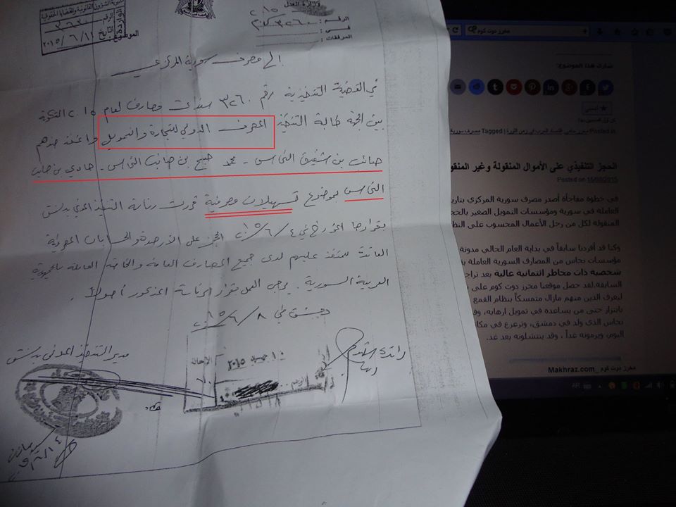 ولتأكيد أن النظام يلعب على المكشوف، في نهاية العام 2013 ألقت "وزارة المالية" لدى النظام، الحجز الاحتياطي على الأموال المنقولة وغير المنقولة لرجل الأعمال السوري "محمد المرتضى الدندشي"، وذلك لثبوت "تورطه في تمويل العصابات الإرهابية المسلحة والتحريض على الأعمال الإرهابية"، وتعاطفاً مع هذا القرار أصدر" مركز المقاصة والحفظ المركزي" في " بورصة دمشق" قراراً بإلقاء إشارة الحجز الاحتياطي على كافة الأسهم والأرباح العائدة لـ "الدندشي" عضو مجلس إدارة بنك بيبلوس –سورية. ويملك الدندشي حصة 2.85% من أسهم "بنك بيبلوس سورية"، كما يعد الدندشي شريك ومؤسس في شركة "شام كابيتال" للوساطة والخدمات المالية والتي تعمل لصالح رامي مخلوف.