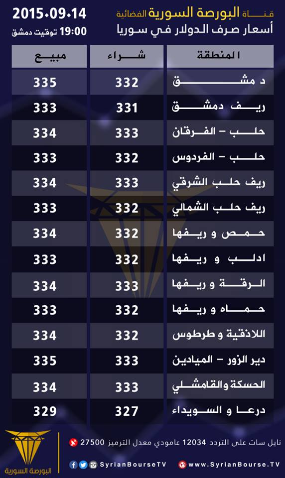 وسجل الدولار بدمشق، مساء الاثنين، 332 ليرة شراء، 335 ليرة مبيع، وهو أعلى سعر للدولار مقابل الليرة، منذ ولادة العملة المحلية السورية.