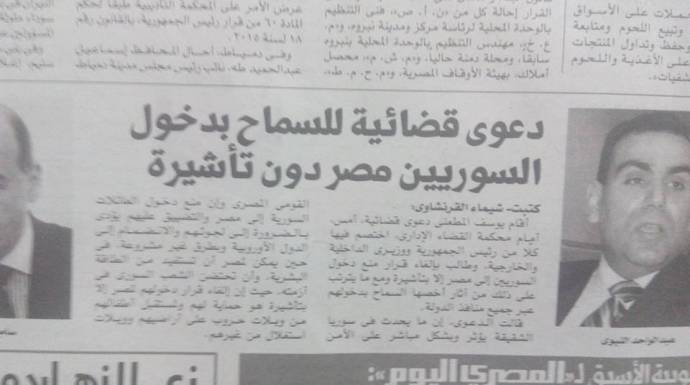 أقام المحامي المصري "يوسف عبد الرحيم" دعوى قضائية بمجلس الدولة في جمهورية مصر، يطالب فيها بإلغاء القرار الصادر من وزارة الداخلية المتضمن منع دخول السوريين إلى مصر إلا بتأشيرة، مع ما يترتب على ذلك من آثار تتعلق بالسماح بدخول السوريين إلى مصر عبر كافة منافذ الجمهورية.