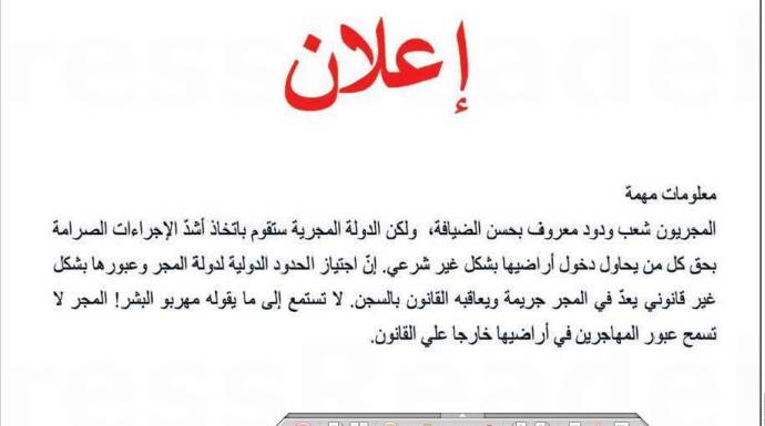 وجاء في الإعلان الذي نشرته جريدة "الغد" اليومية باللغتين العربية والإنكليزية تحت عنوان "معلومات هامة": "المجريون شعب ودود معروف بحسن الضيافة ولكن الدولة المجرية ستقوم باتخاذ أشد الإجراءات الصارمة بحق كل من يحاول دخول أراضيها بشكل غير شرعي".