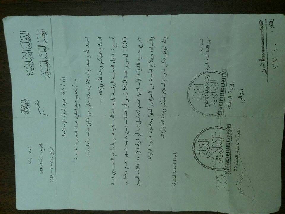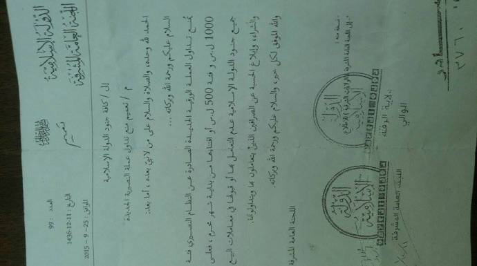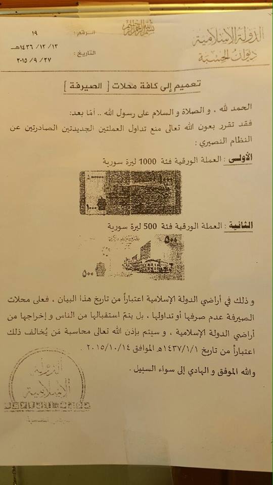 أصدر ديوان الحسبة، في تنظيم "الدولة الإسلامية"، تعميماً، منع بموجبه تداول العملة السورية الجديدة من فئة الـ 1000 ليرة الجديدة، وفئة الـ 500 ليرة الجديدة، اعتباراً من 14/10/2015.