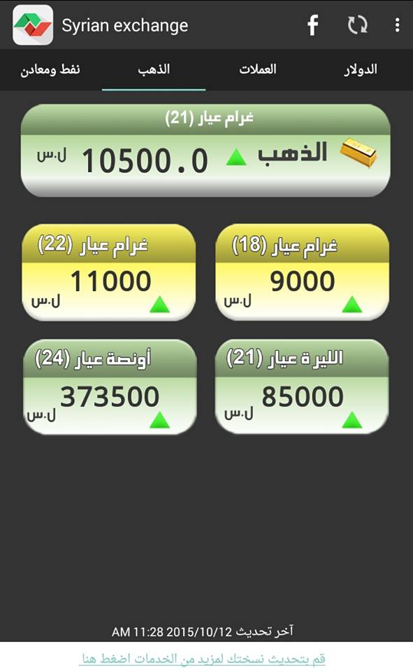 وحسب بيان لجمعية الصاغة بدمشق، بات غرام الذهب عيار الـ 21 عند 10500 ليرة، بزيادة 100 ليرة عن سعر السبت، فيما بات سعر غرام الـ 18 بـ 9000 ليرة.
