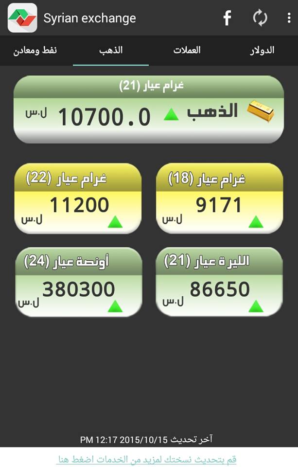 وكان الذهب سجل أمس الأربعاء أعلى سعر له في تاريخ سوريا عند 10600 ليرة لعيار الـ 21، لكنه تجاوزه اليوم الخميس.