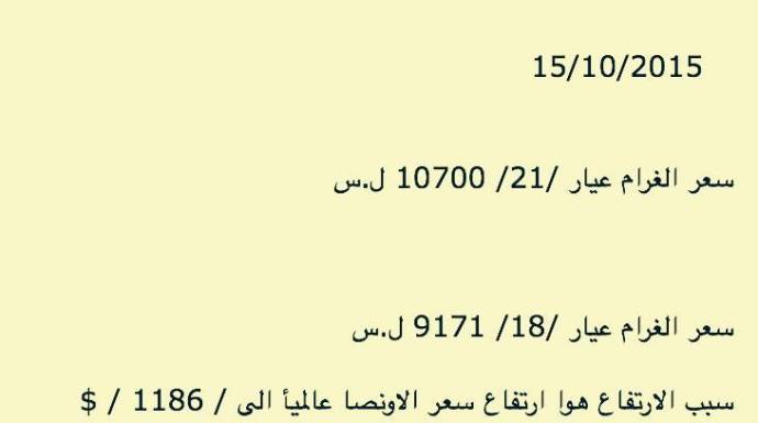 وحسب بيان للجمعية، أصبح سعر غرام الذهب عيار الـ 21 عند 10700 ليرة، بزيادة 100 ليرة على سعر أمس، فيما أصبح سعر غرام الـ 18 عند 9171 ليرة.