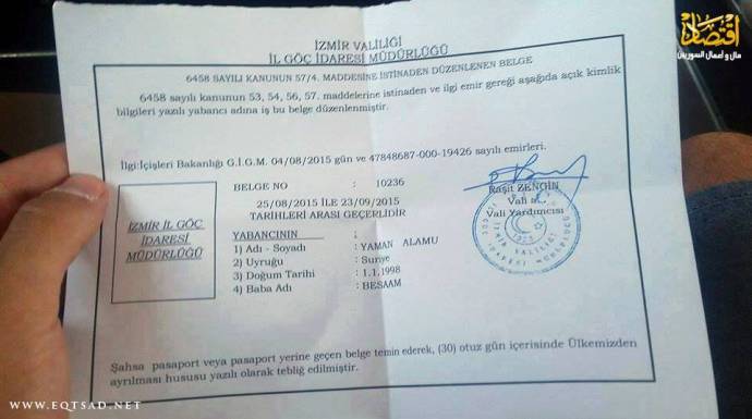 (الأوراق تقضي بحسب علامو، بطرد الموقع عليها من الأراضي التركية، مضيفاً "تهدف السلطات التركية من الاعتقال إلى إلقاء القبض على المهربين، فلو كنا نحن الهدف لماذا أطلق سراحنا إذن". علامو بدوره بات قبل أيام قليلة في الأراضي الألمانية بعد أن نجح في محاولته اللاحقة للهجرة.