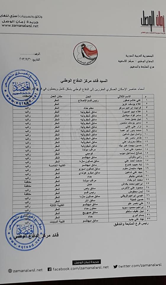 وقد حصل "اقتصاد" على وثيقة صادرة عن "مركز الدفاع الوطني باللاذقية" تورد أسماء 32 عنصرا في المليشيا، تم فرزهم من "مؤسسة الإسكان العسكري" التابعة لوزراة الدفاع.
