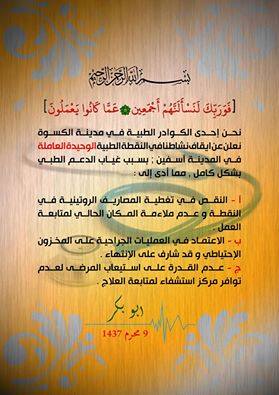 وتابع البيان موضحاً أن من أسباب التوقف "الاعتماد في العمليات الجراحية على المخزون الاحتياطي الذي شارف على الانتهاء". وأردف البيان أن "النقطة لم تعد تستوعب المرضى لعدم توافر مركز استشفاء لمتابعة العلاج".
