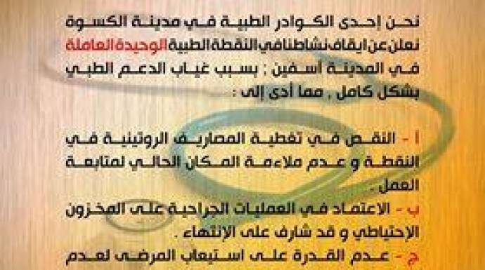 أعلنت الكوادر الطبية المشرفة على النقطة الطبية الوحيدة في مدينة الكسوة بريف دمشق، عن إيقاف نشاطاتها بسبب غياب الدعم الطبي بشكل كامل.