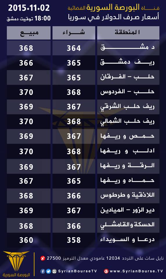 وفيما يلي قائمة بأسعار الدولار في مختلف المحافظات السورية، حسب "قناة البورصة السورية الفضائية":