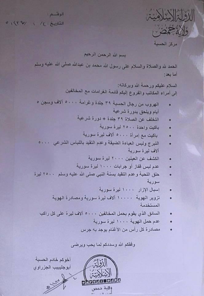 ذكر نشطاء أن مركز الحسبة في "ولاية حمص" التابع لتنظيم "الدولة الإسلامية"، أصدر قراراً حدد فيه قائمة بالمخالفات التي تستوجب العقوبة التعزيرية أو الغرامة المالية في كل من مدينتي تدمر والقريتين.