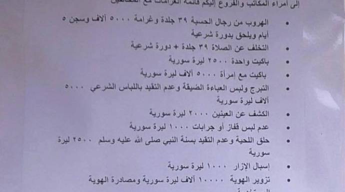 ونشر الناشط "أبو شام الرقة" على حسابه في موقع "فيسبوك" صورة للقرار، توضح المخالفات، ومن بينها، الهروب من رجال الحسبة وعقوبته 39 جلدة وغرامة 5000 ليرة، وسجن 5 أيام، يُلحق المخالف بعدها بدورة شرعية.
