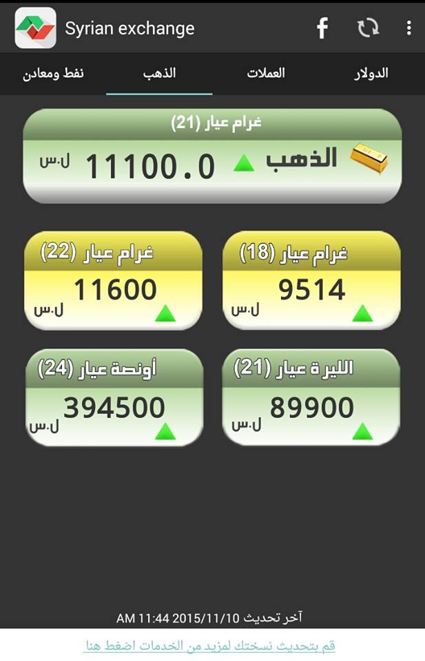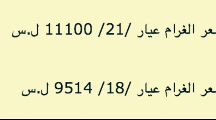 وحسب جمعية الصاغة بدمشق، سجل الذهب غرام الـ 21، 11100 ليرة، بزيادة 100 ليرة، فيما أصبح غرام الـ 18 بـ 9514 ليرة.