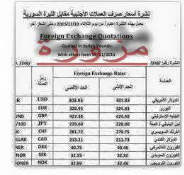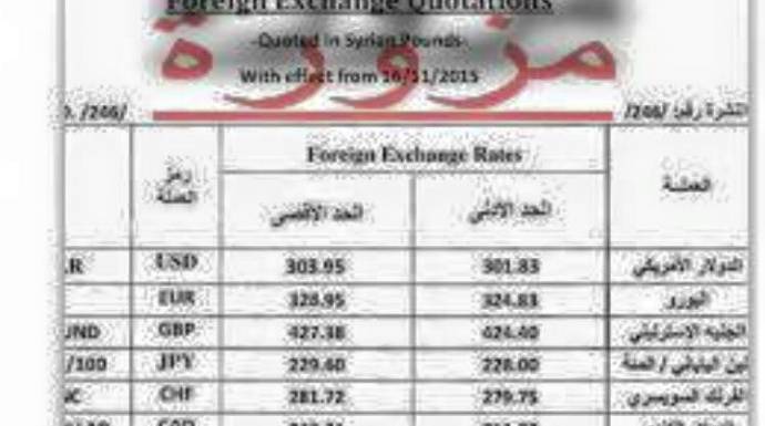 تداول المشتغلون في مجال صرافة العملة بسوريا نشرة عملات صادرة عن مصرف سوريا المركزي يظهر فيها أن الأخير قفز بالسعر الرسمي للدولار 20 ليرة دفعة واحدة، لكن اتضح لاحقاً بأن هذه النشرة مزورة، دون أن يتضح بعد من الجهة التي تقف وراء تزويرها.