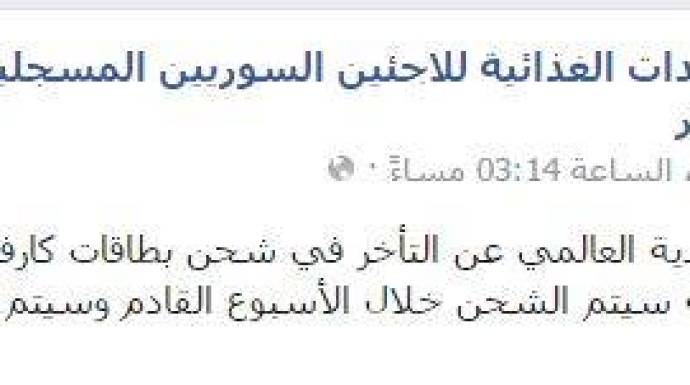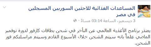 في خطوة غير مسبوقة، اعتذر برنامج الأغذية العالمي في مصر من مستفيديي البرنامج، عن التأخر في شحن بطاقات كارفور لدورة تشرين الثاني/ نوفمبر. وأبلغ البرنامج اللاجئين السوريين بأنه سيتم الشحن خلال الأسبوع القادم على أن يتم مراسلتهم فور الشحن.